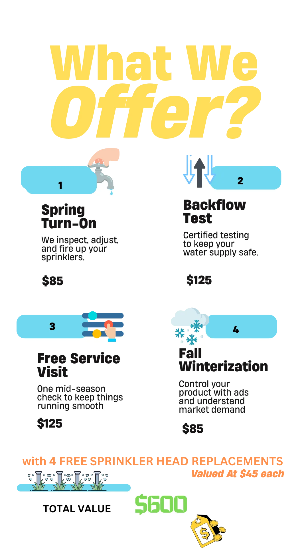 Our Annual Plan includes everything your sprinkler system needs, all year long. We’ll start with a full Spring Turn-On to activate and inspect your system, followed by a mid-summer Dry Spot Adjustment to ensure even water coverage. You’ll also get up to four sprinkler head replacements at no extra cost. Finally, we’ll return in the fall for a complete Winterization Service to protect your system from freezing. One plan, all seasons, zero stress.